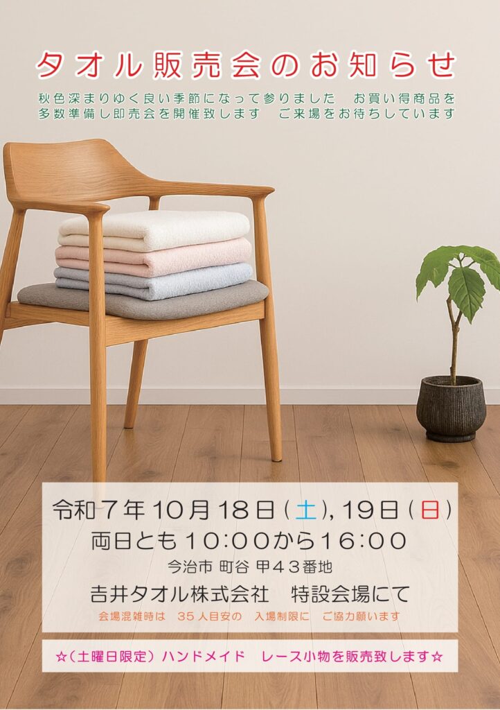 令和7年10月18日(土)・19日(日)の2日間、秋のタオル即売会を開催いたします。日々の暮らしにくつろぎ・やすらぎ・彩りを添えるタオル御入用の方は、よろしくご来場ください。